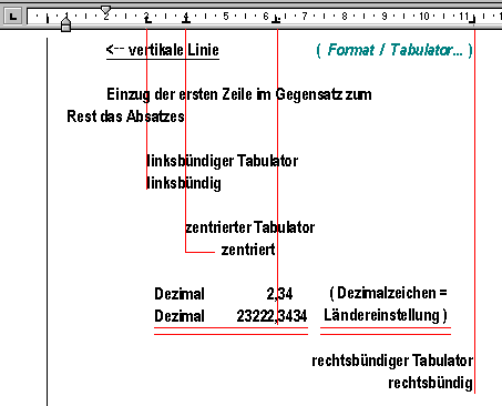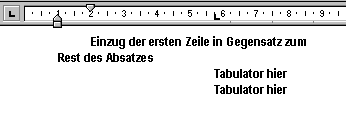 Das Lineal ( Ansicht / Lineal ) zeigt nicht nur die Tabulatoren, sondern auch den jeweiligen Absatz - Einzug an. Bei komplexen Absatz - und Seitenformatierungen immer darauf achten, daß der entsprechende Bereich dabei vollständig markiert ist!