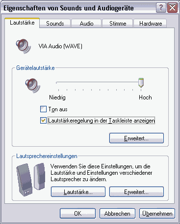 Noch detaillierter in Systemsteuerung / System / Hardware / Gerätemanager mit der rechten Maustaste auf alle Audiogeräte in "Audio - , Video und Gamecontroller" klicken und "Eigenschaften" anzeigen lassen; insbesondere den Mixer des Audiocontrollers.